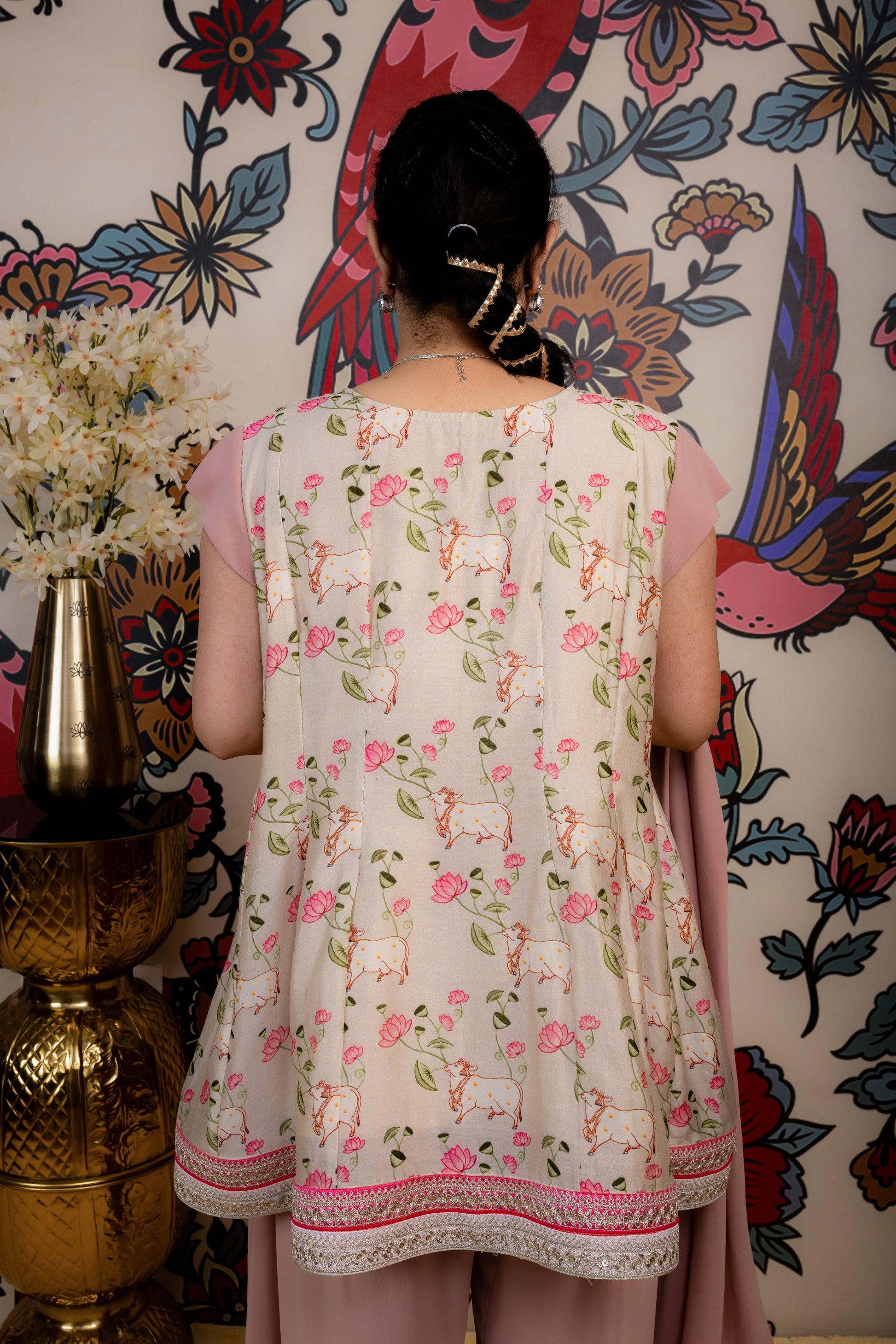 The pastel floral-printed kurta features subtle detailing along the hem, perfectly complemented by solid blush straight pants for a balanced and sophisticated look. The matching dupatta, finished with delicate edging, adds a touch of effortless charm and fluidity.