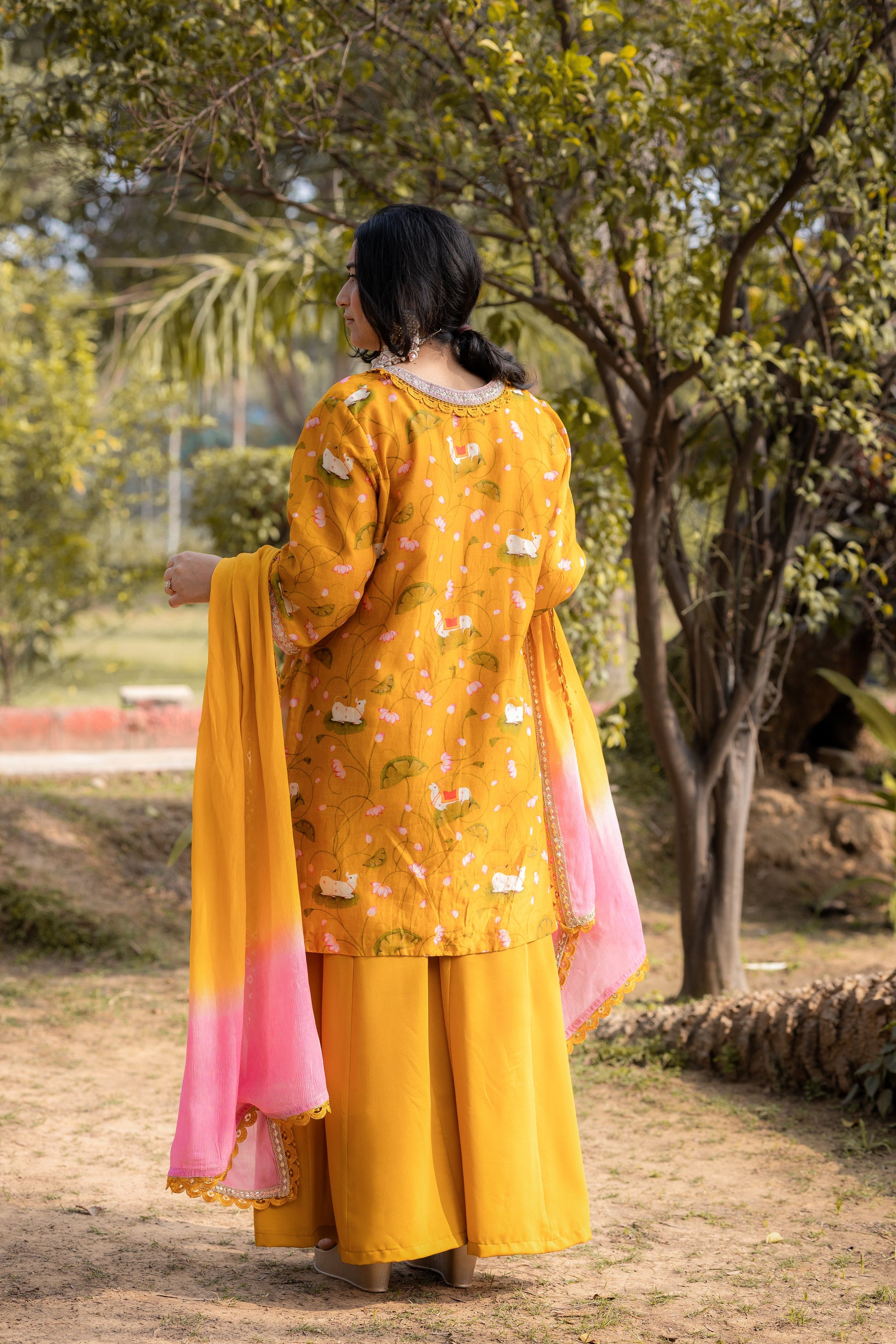 The ensemble is paired with flowy wide-leg palazzo pants that offer ease of movement and a flattering silhouette. A beautifully draped ombre dupatta in mustard and blush pink, finished with subtle lace edging, adds a romantic touch to the outfit.