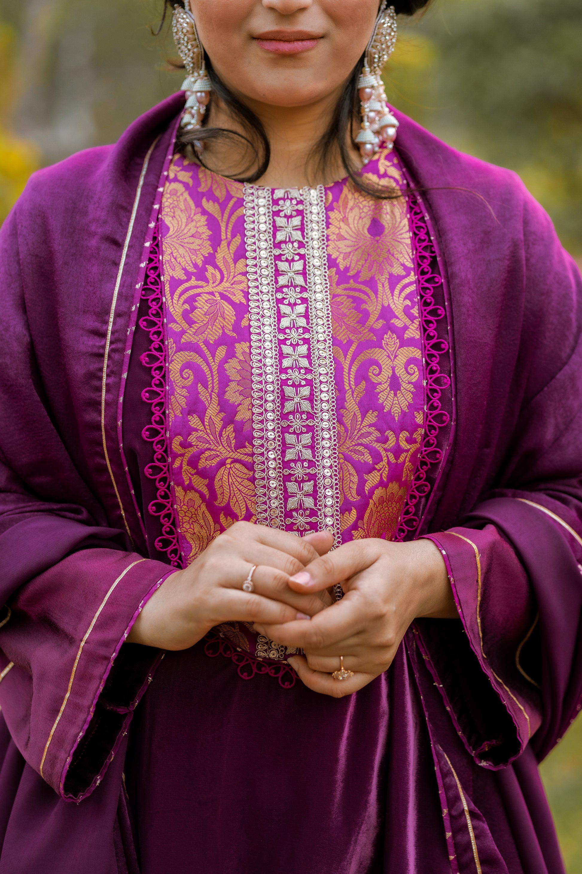Elevate your ethnic wardrobe with this exquisite royal plum velvet suit set, crafted for timeless elegance and luxurious comfort. The rich velvet fabric drapes beautifully, offering a soft, opulent feel perfect for festive gatherings, weddings, and evening occasions.